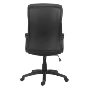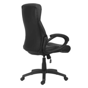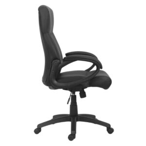 A szék fekete, puha textilbőr kárpitozása kellemes tapintású, könnyen tisztítható, és prémium hatást kelt, miközben megőrzi a kényelmet a közepes időtartamú használat során. A magas háttámla megfelelő támaszt nyújt a hátnak, vállaknak, így hozzájárul a kényelmes testtartáshoz.